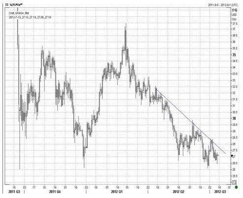 周四, 贵金属市场整体处于盘整局面,黄金价格小幅收跌,但白银价格却小幅上涨。从目前的情况来看,美国一周初请失业金人数降至四年的低位,也降低了市场投资者对于更多货币刺激预期的期望。相反,美元指数借助欧债危机和美联储并无更多量化措施的动力,显示出很好的上行态势,从6月初的81.50附近位置不断上行至五月下旬的前期高点83.50上方,并可能短期突破84的整数关口。在美元指数大幅上行和无更多宽松措施的双重作用下,贵金属市场整体还将面临下行压力。